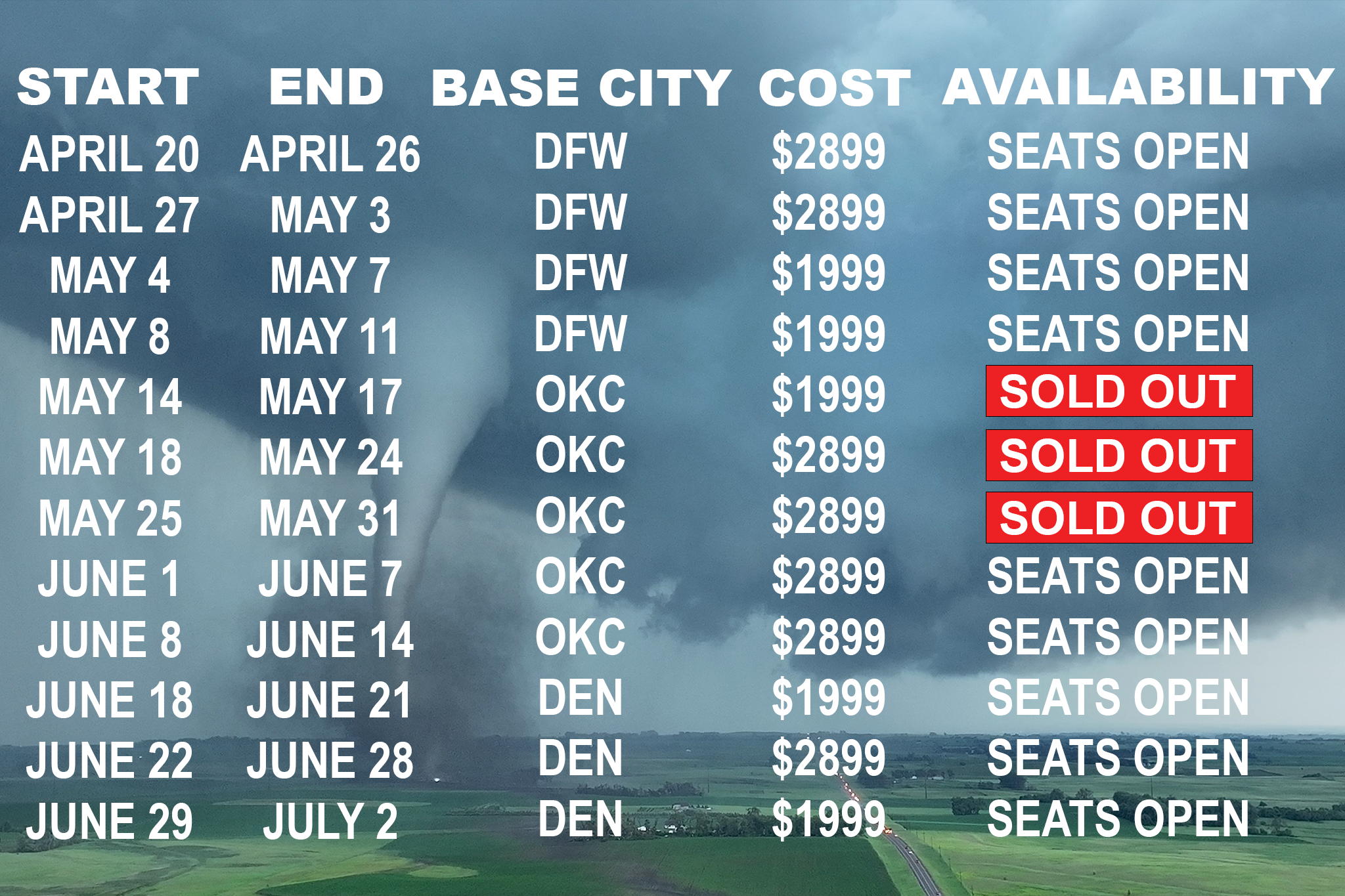 Guest safety has always been our top priority. We don’t drive through dangerous heavy precipitation cores with rainwrapped tornadoes. Our storm chase vehicles have never been damaged in an accident or by severe weather. We’ve never been tossed by a tornado and our windows have never been blown out by wind, hail, or debris.